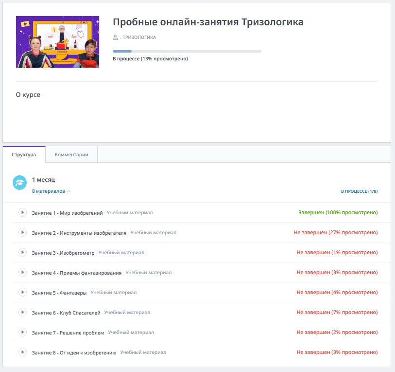В рамках проекта было создано 8 онлайн-занятий по курсу «Тризологика», основанному на ТРИЗ-технологии (теории решения изобретательских задач). Эти занятия предназначены для самостоятельного изучения детьми 7-9 лет под руководством педагога или родителя. Программа «Тризологика» в 2025 году получила статус участника инновационного центра «Сколково», что подтверждает её инновационный потенциал.